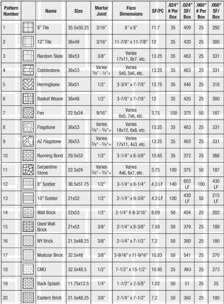 Adhesive-backed stencils are used to create patterns in overlay systems. Ideal for stucco applications and concrete overlay systems. Create the look of brick, stone, tile, etc., without the cost. Single-use, peel off the release paper, stick it to the surface, and apply an overcoat.